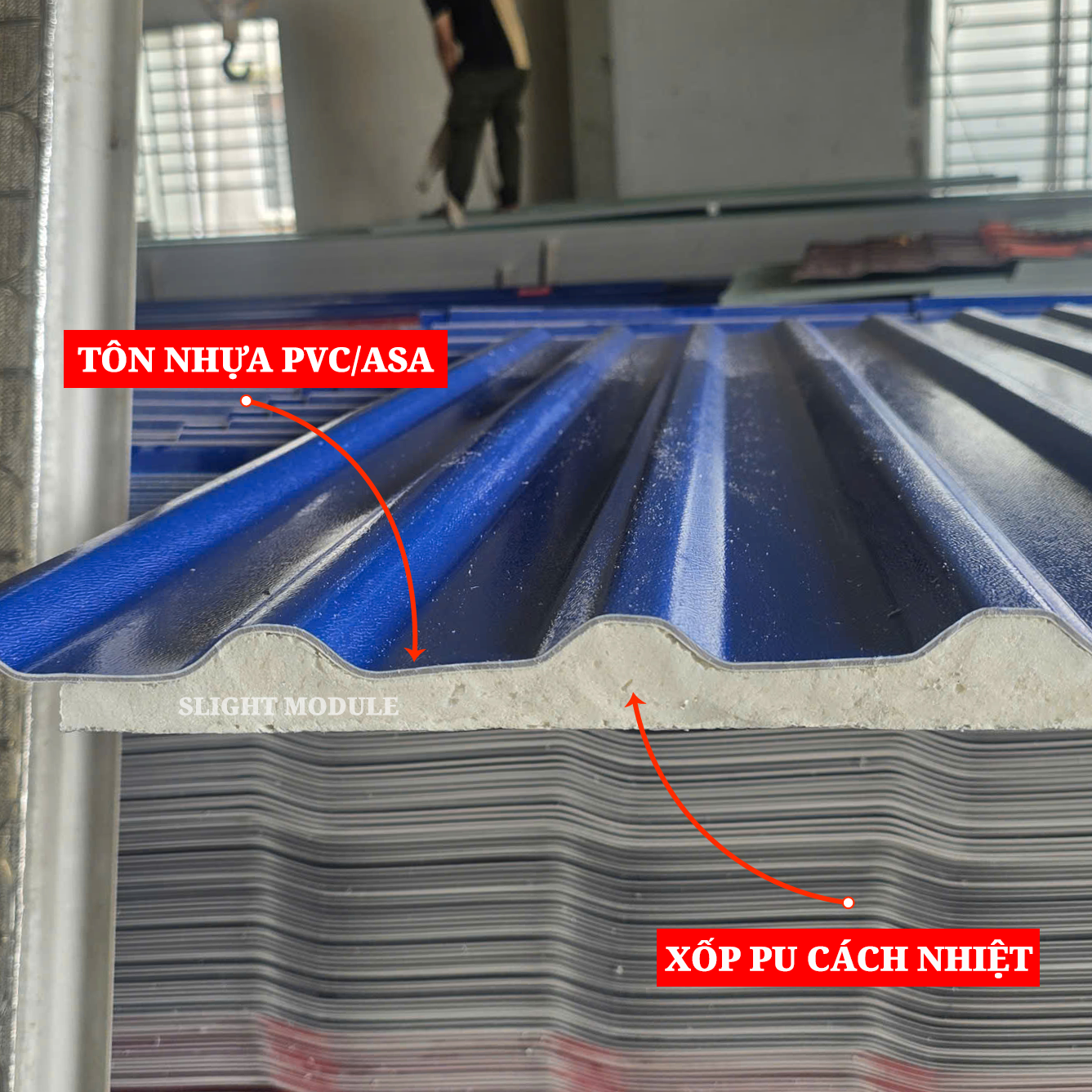 Tôn nhựa xốp PU là loại vật liệu lợp mái cao cấp, gồm 3 lớp liên kết chặt chẽ: ASA/PVC - PU - PVC. Nhờ cấu trúc này, sản phẩm có khả năng cách nhiệt, chống ồn và chống ăn mòn vượt trội so với tôn kim loại truyền thống.